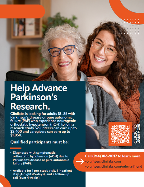 We're pleased to share that Clinilabs is enrolling individuals, 18-85 years old, with neurogenic orthostatic hypotension (nOH) due to Parkinson’s disease or pure autonomic failure (PAF). The purpose of the study is to see how effective different doses of the study drug are in increasing the blood pressure of people